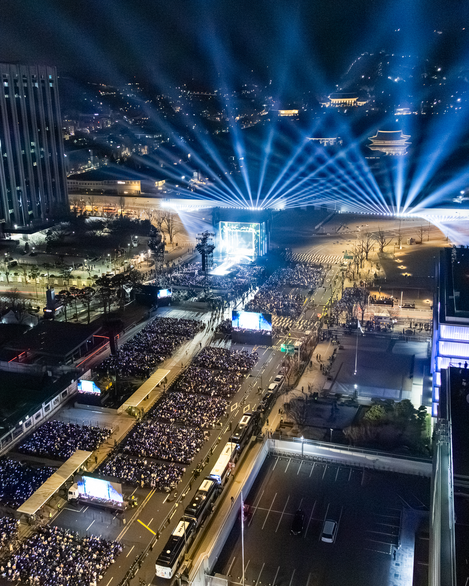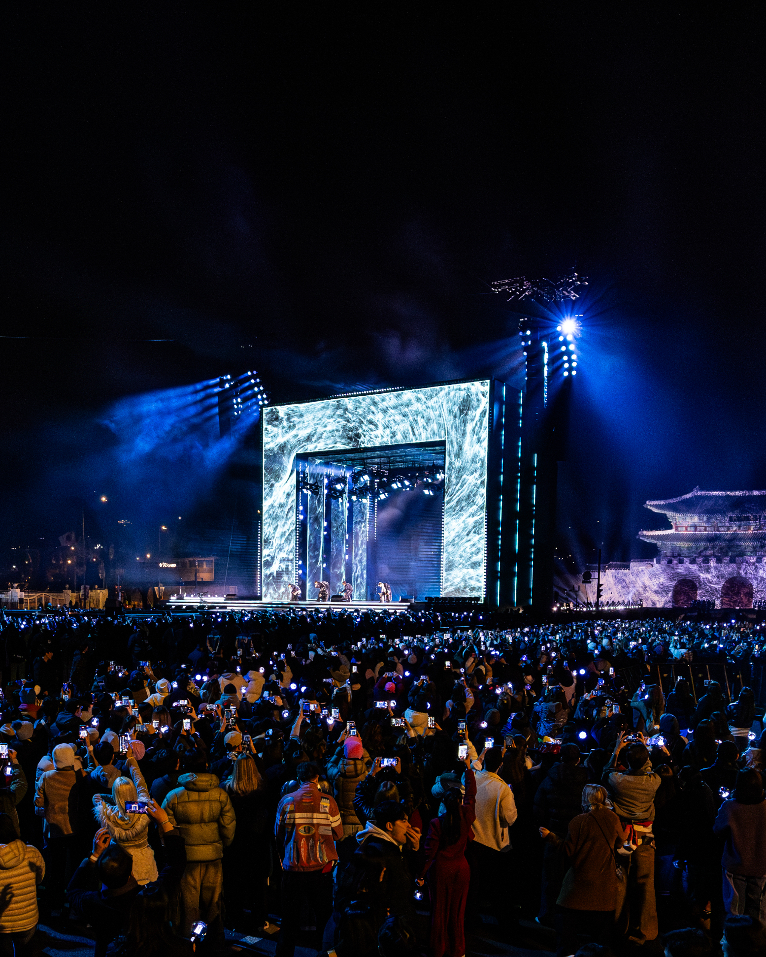 The concert venue utilized every aspect of the Square, extending about 1.2 km to Seoul City Hall. According to Netflix VP of Production Jonathan Mussman, about 1,075 production staff were hired for staging, tech, cameras, lights, editing, and more, with the majority being local Korean staff. Their base was set up near the Sejong Performing Arts Center, with 5.90 miles of power cable supplying the entire event. The team used a 23-camera setup to capture the best angles for the show—the same one used to film the Avatar movies. There were several special cameras used to document the massive crowds that all gathered to witness this moment, including on several rooftops.